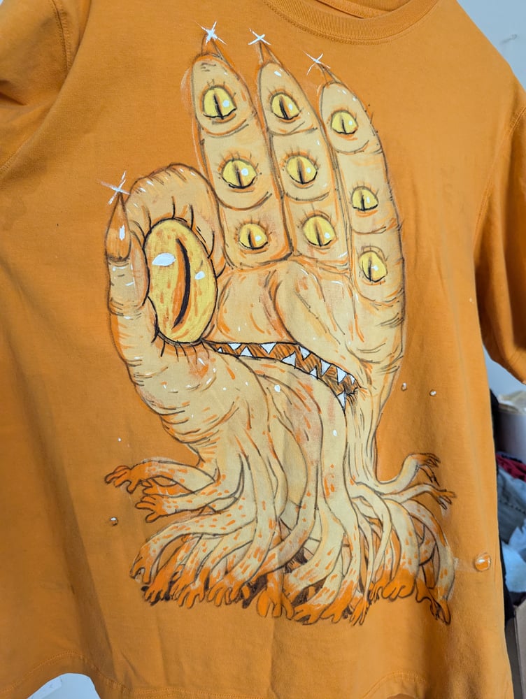 Rich yellow poly cotton shirt, size large, featuring a one of a kind illustration of a hand covered in eyes, with more hands for feet. This shirt should be washed gently, and hung to dry to prolong the longevity of the illustration.
